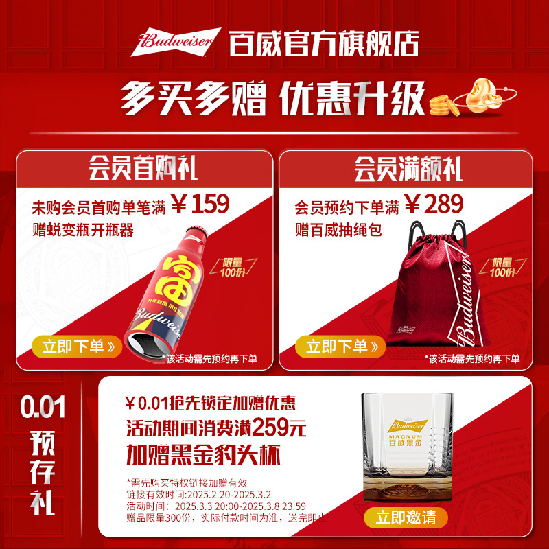商品简介:【部分人有5元惊喜直降,到手74元百威啤酒大促销!经典红罐450ml*20听单只3.7元】,优惠力度空前,截止时间仅剩不到一周,错过再等一年!尽享团圆小酌的快乐,欢庆时光的惬意。抓紧时间,让百威陪你度过每一个美好的时刻!