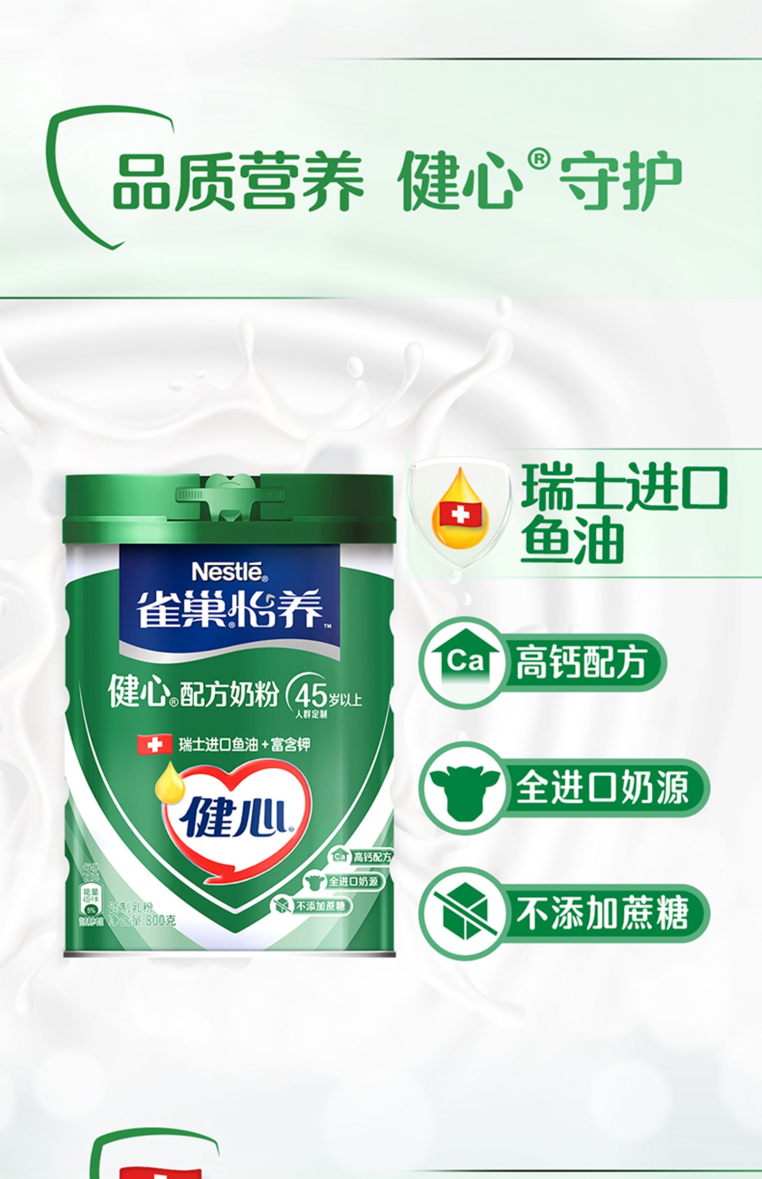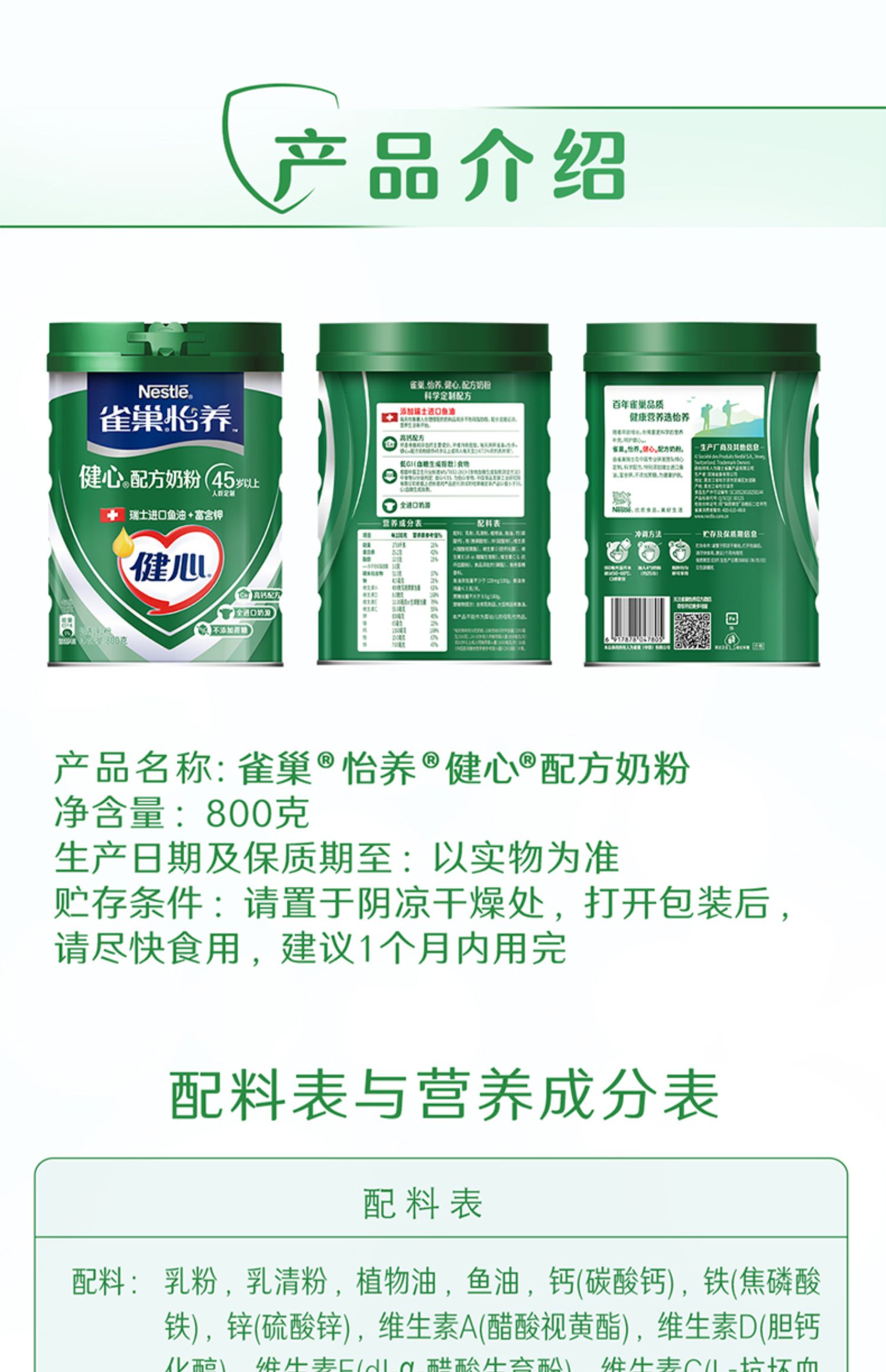 商品名称:【旗舰店】雀巢怡养健心高钙营养中老年奶粉鱼油配方奶粉800g罐