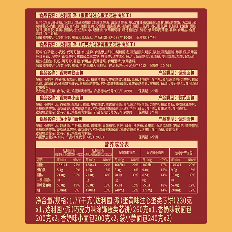 商品名称:达利园小面包软面包菠小萝巧克力派蛋黄派休闲零食5口味混合整箱