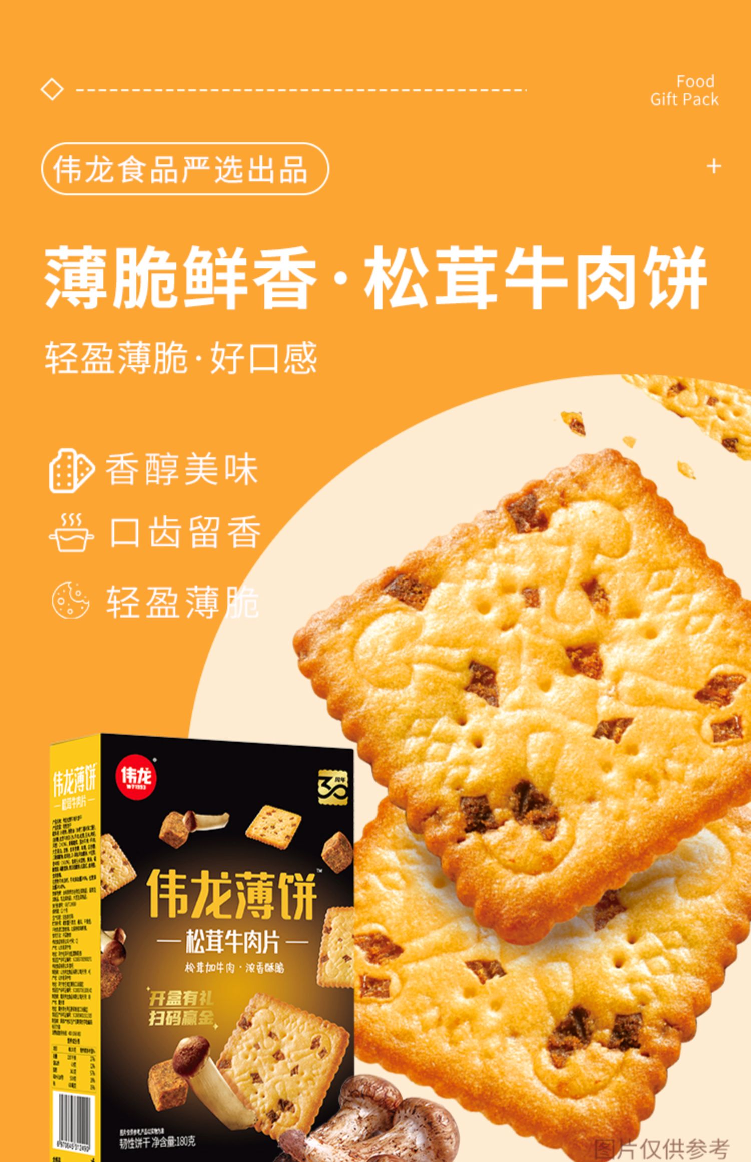 商品简介:【任选3盒!】伟龙薄饼小饼干180g*3盒共540g,原价:47.7,卷后:24.9,限时礼金1元!叠加200-30,到手16.7元