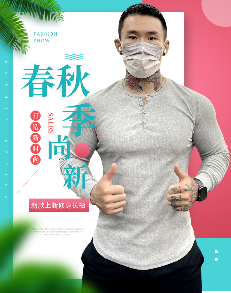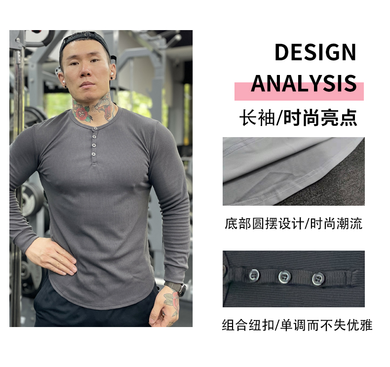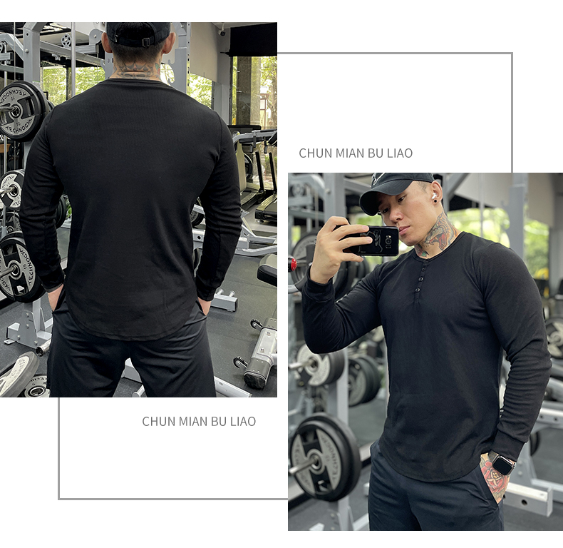 商品介绍:美式运动长袖亨利打底衫男棉硬汉T恤弹力