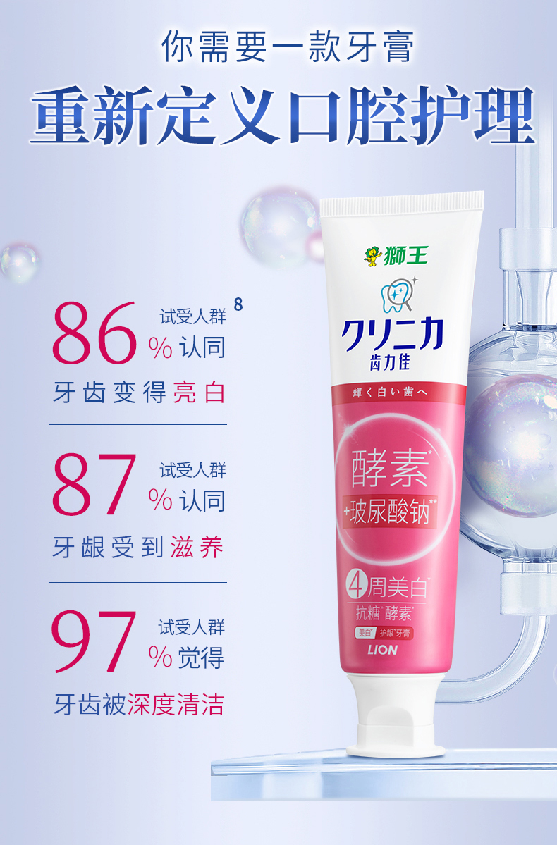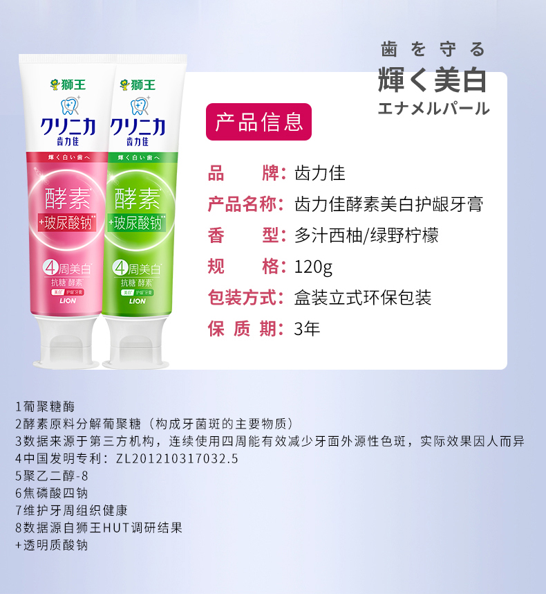 商品名称:LION狮王齿力佳酵素专研美白牙膏玻尿酸去黄清新口气含氟官方正品