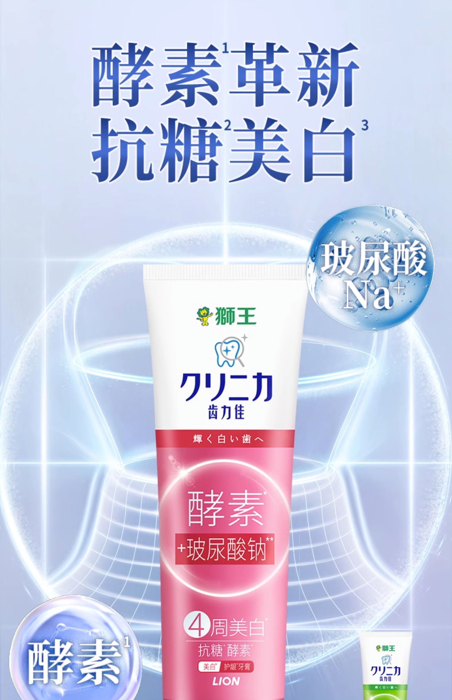商品简介:LION狮王齿力佳抗糖酵素美白持久护龈玻尿酸牙膏去黄含氟,调节口腔酸碱平衡,减少牙菌斑,改善口腔环境!赶快囤起来吧!