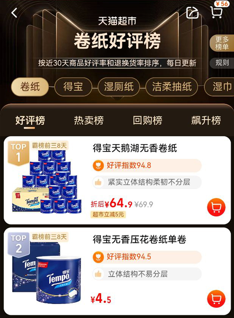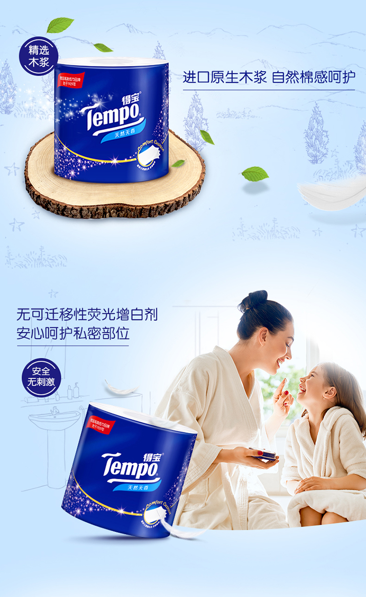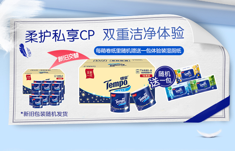 商品名称:Tempo/得宝卷纸无香卫生纸厕纸加厚卷筒纸家庭优惠装160克*16卷